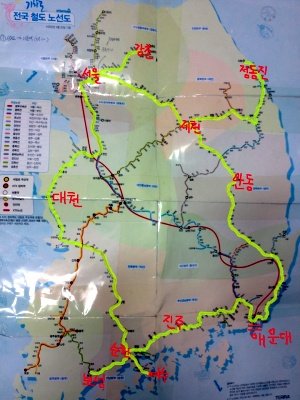 서울역 -> 강촌 - > 서울역 -> 제천 -> 강릉 -> 정동진 -> 제천 -> 안동 -> 해운대 -> 진주 -> 순천-> 여수 -> 순천 -> 보성 -> 순천 ->대천 -> 서울(영등포)