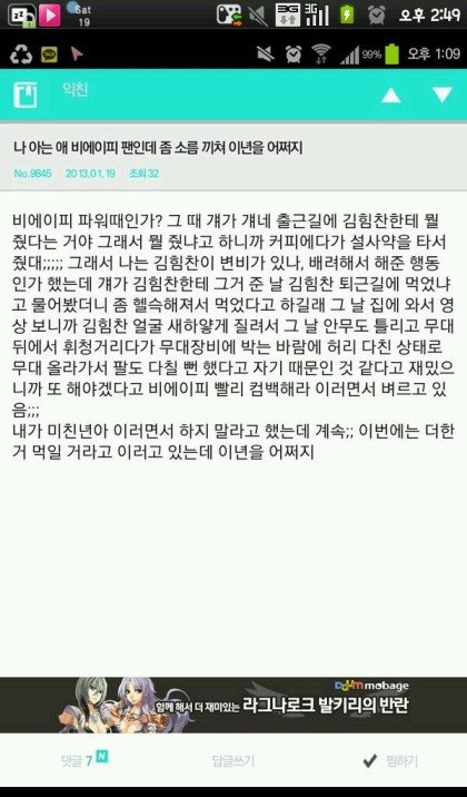 내친구중에 비엪팬이 있는데 내친구가 나한테 말해준거 있는데 좀 충격이드라;;비엪 파워할때 사생팬이 힘찬한테 커피마시라고 줬는데 그 커피에 설사약이랑 기름넣었대ㅋㅋㅋㅋ 좀 에바아냐?