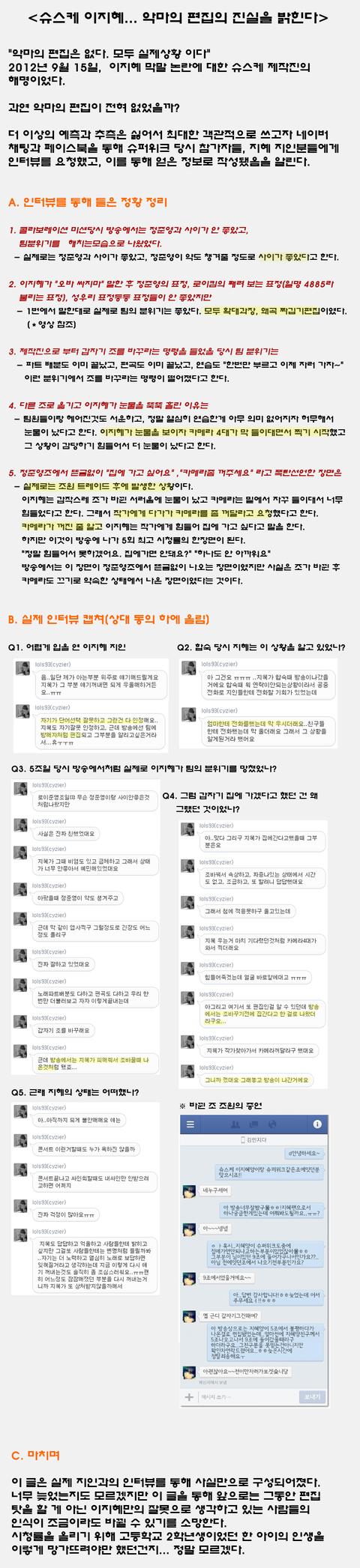 이지혜가 말한 것들이 잘못되지 않았다고 하는 게 아니라 분명 이지혜양도 그 부분에 있어선 반성하고 있고 이 글의 취지는 슈스케4 이지혜양이 악마의편집으로 인해 욕먹었던 부분(짜깁기와 왜곡편집)을 바로 잡았으면 하는 점입니다.