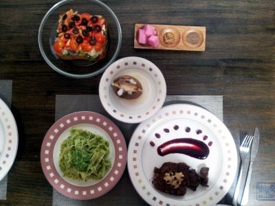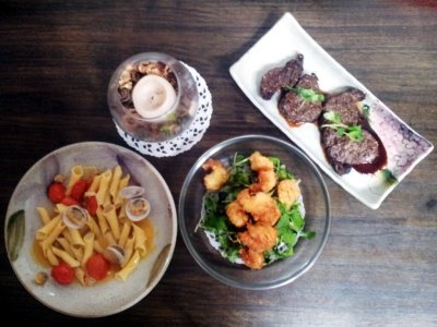 렌틸콩 가르가넬라 파스타랑, 코코넛 쉬림프랑 스테이크.