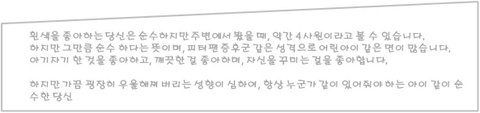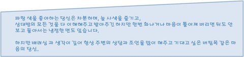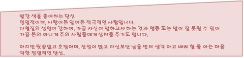 스마트폰 컬러로 본 나의 성향빨강빨강 색을 좋아하는 당신정열적이며,사랑이든 일이든 적극적인 사람입니다.다혈질의 성향이 강하여,가끔 자신이 말하고자 하는 것과 행동 또는 말이 잘 못될 수 있어가끔 본의 아니게 주의 사람들에게 상처를 주기도 합나다.하지만 뒷끝없고 호탕하며,잔정이 많고 자신보단 남을 먼저 생각 하고 배려 할 줄 아는 마음약한 정열적인 당신파랑파랑 색을 좋아하는 당신은 차분하며, 늘 사색을 즐기고,상대방의 모든 것을 다 이해해주고 받아주긴 하지만 한번 화나거나 마음이 틀어져 버리면 뒤도 안보고 돌아서는 냉정한 면도 있습니다.하지만 배려심 과 생각이 깊어 항상 주변의 상담과 조언을 많이 해주고 기대고 싶은 버팀목 같은 마음의 당신.흰색흰색을 좋아하는 당신은 순수하지만 주변에서 봤을 때, 약간 4차원이라고 볼 수 있습니다.하지만 그만큼 순수 하다는 뜻이며,피터팬증후군 같은 성격으로 어린아이 같은 면이 많습니다.아기자기 한 것을 좋아하고,깨끗한 걸 좋아하며,자신을 꾸미는 걸 좋아합니다.하지만 가끔 굉장히 우울해져 버리는 성향이 심하여,항상 누군가 같이 있어줘야 하는 아이 같이 순수한 당신
