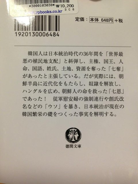 번역을 하자면 대충... 한국인은 일본통치시대 36년간을 「최악의 식민지 지배」라고 규탄해, 주권, 국왕, 인명, 국어, 성씨, 토지, 자원을 빼앗은 「7탈」이라고 주장하고 있지만 실제로는 한반도에 근대화를 가져와, 노예를 해방시키고, 한글을 널리 알리고, 조선인의 생명을 구한 「7은(7가지 은혜)」였다!