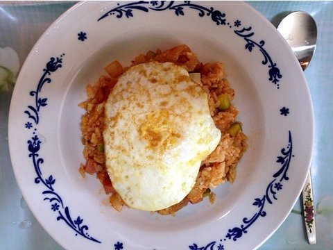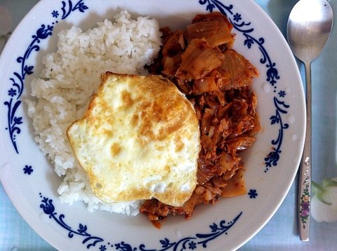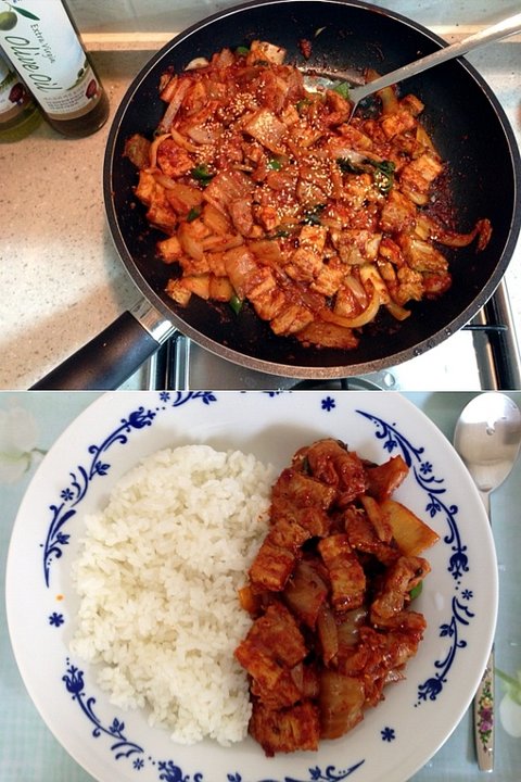 적당히 익은 김치랑 밑간한 삼겹살에 양념장 넣고 볶아서 밥에 비벼먹으면 Good!