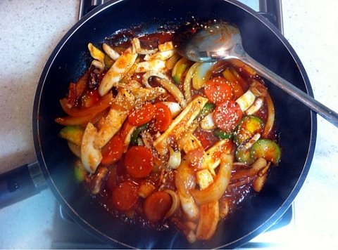 마트에서 뭐 살까 둘러보다가 생물 오징어 세일하는거 득템해서 애호박 당근 양파 넣고 휙휙 볶아줌.