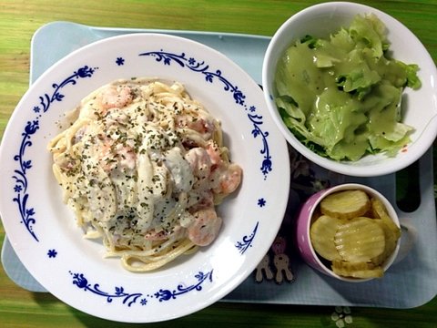 처음으로 까르보나라 도~전! 생크림과 우유 비율 2:1로 해서 소금,후추로 간하고 새우살,베이컨,양파 등 같이 볶아주고 계란 노른자만 딱 넣어서 위에 파슬리 솔솔 뿌려주면 완성. (나만의 비법은 슬라이스 치즈 1장 같이 넣어주는 거임. 이렇게 하면 소스가 진해지고 걸죽해짐.) 느끼함을 달래줄 샐러드와 아삭아삭한 생오이 피클로 마무리하면 여기가 양식 레스토랑임
