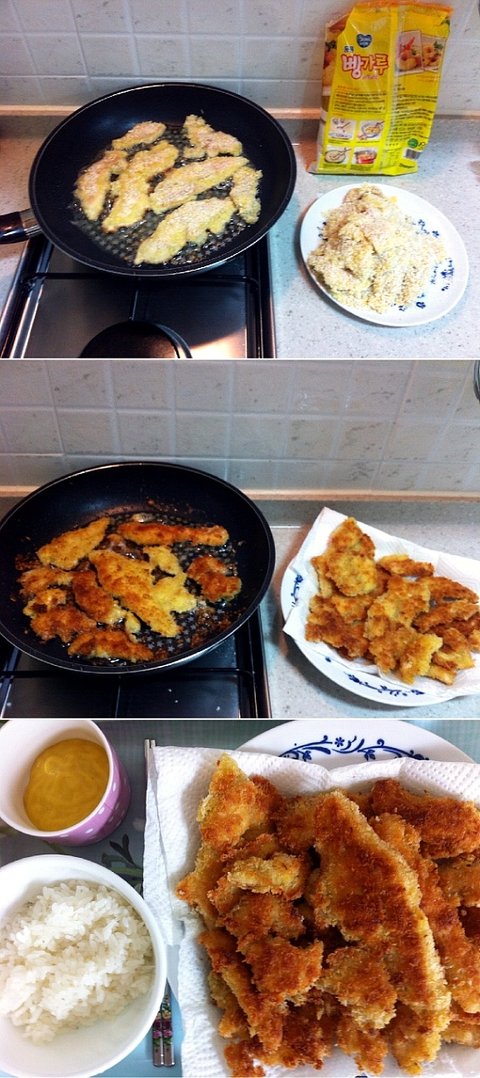 닭 안심살(닭 찌찌살로 하셔도 되요. 전 부드러운거 좋아해서 안심으로 했음.) 힘줄 제거하고 허브솔트 뿌려서 밑간해줌→계란옷 곱게 입히기→부침가루 치덕치덕→빵가루 꾹꾹 눌러서 마무리→포도씨유 두른 팬에 열 오르면 튀김(두번 튀겨야 바삭바삭) 뒷정리는 Go To HELL![]()