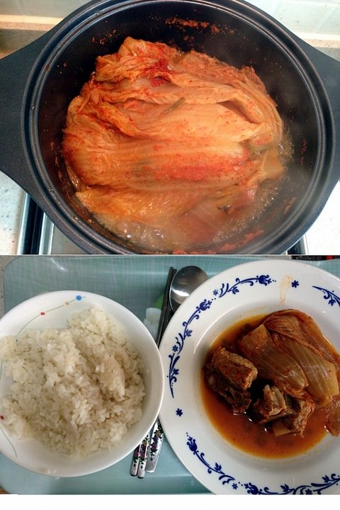 글쓴이는 이거 있으면 밥 두공기도 뚝딱 해치움. 집 근처에 김치찜으로 유명한 곳이 있어서 가끔 사먹긴 하는데 집에서 만들어보고자 결심함. 돼지갈비 핏물 빼주고 육수(멸치새우다시마 넣은) 끓으면 거기에 돼지갈비랑 양파 바닥에 깔고 위에 묵은지 반포기 정도 통째로 얹어서 오랜시간 끓이면 완성. 묵은지에 돼지갈비 살점 올려서 밥에다가 먹으면 밥도둑이 따로없어요. (그런데 이것도 사먹는 편이 훨씬 싸요. 혼자서는 아무래도 해먹는거 보다 사먹는게 더 싼듯.)