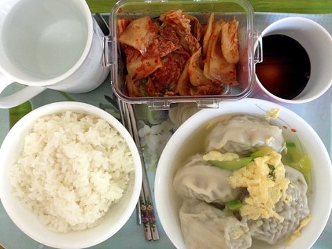 자취생이나 요리 초보가들에게 만두 빚는다는건 사치임. 그렇지만 전 건강식을 지향하므로 그나마 안심되는 비싼 유기농 왕만두 구입. 육수에 만두 적당량 넣고 끓이다가 애호박,양파(당근은 싫어해서 안넣음) 채 썰어 넣고 또 끓임. 마지막으로 계란 한알 휙휙 풀어넣어 주고 소금으로 간 맞추면 끝.