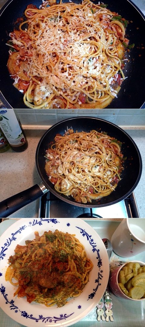 올리브유 두른 팬에 마늘로 향을 내준 후 피망,양송이,양파,햄 or 베이컨 등 원하는 재료 넣고 볶다가 토마토소스 투척해서 넣고 같이 끓여줍시다. 거기에 삶아놓은 스파게티 면 넣어서 고루 섞어주고 그 위에 슈레드 치즈 솔솔 뿌려서 녹여주면 아주 맛난 스파게뤼가 됩니다. (비루한 자취생 신분에 오븐이 없어서 후라이팬 뚜껑 올려서 치즈 녹여줬음