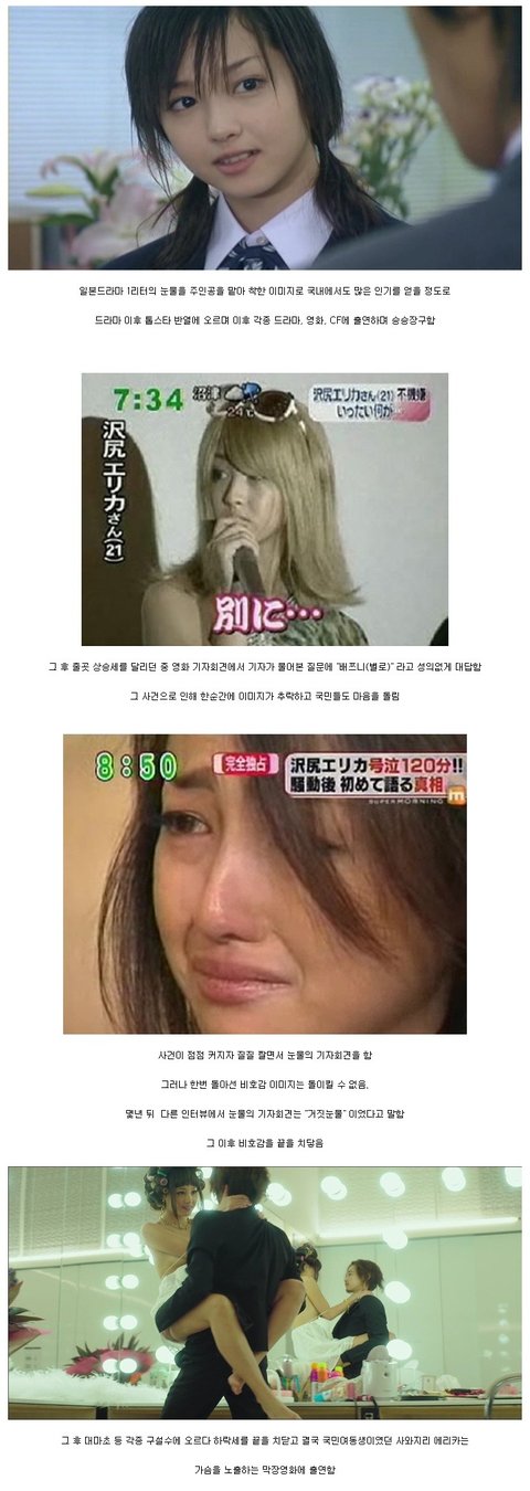 일본드라마 1리터의 눈물을 주인공을 맡아 착한 이미지로 국내에서도 많은 인기를얻을 정도로 드라마 이후 톱스타 반열에 오르며이후 각종 드라마, 영화, CF에 출연하며 승승장구함. 그후 줄곳 상승세를 달리던 중 영화 기자 회견에서 기자가 물어본 질문에 "배쯔니(별로)"라고 성의없게대답함. 그 사건으로 인해 한순간에 이미지가 추락하고 국민들도 마음을 돌림. 사건이 점점 커지자 질질 짜면서 눈물의 기자회견을 함.그러나 한번 돌아선 비호감 이미지는 돌이킬 수 없음.몇년 뒤 다른 인터뷰에서 눈물의 기자회견은 "거짓눈물" 이었다고 말함. 그 이후 비호감을 끝을 치닿음 그 후 대마초 등 각종 구설수에 오르다 하락세를 끝을 치닫고결국 국민여동생이였던 사와지리 에리카는 가슴을 노출하는 막장영화에 출연함 끝