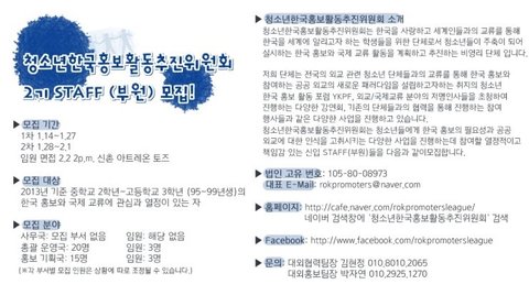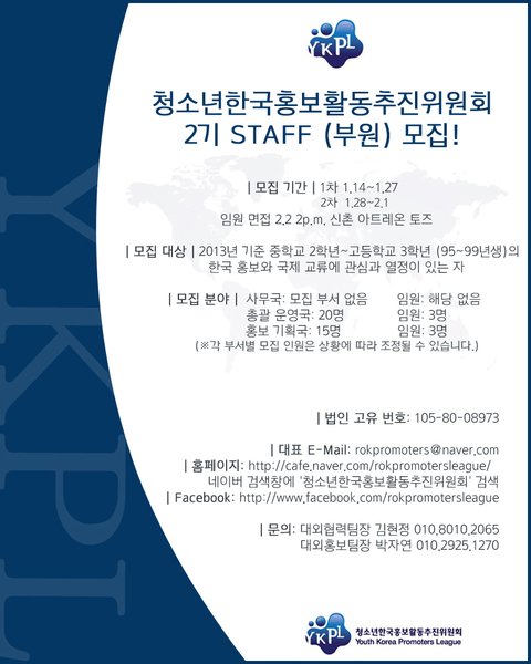 비영리 청소년 단체 청소년한국홍보활동추진위원회(법인 고유 번호: 105-80-08973)가 2기 STAFF을 모집합니다.