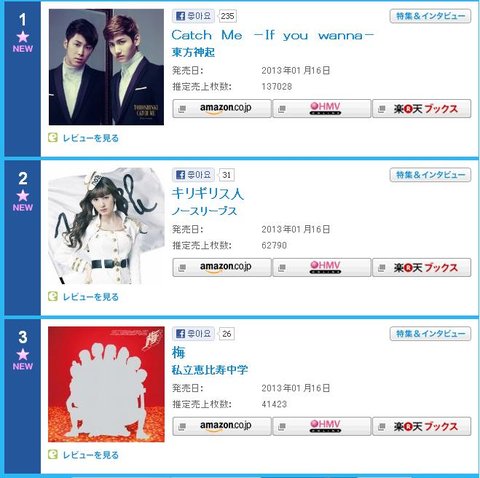 2013년 1월 16일발매 Catch Me-If you wanna- 초동 13만 7028장(싱글 위클리차트 1위)