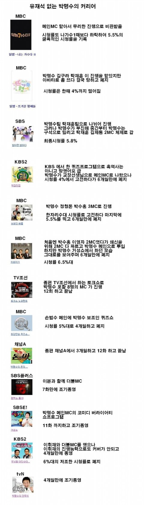 나같으면 한두개 하고 시청률안나오면 포기할텐데 명수옹은 그래도 끝가지 열심히 하는 게 좋음갠적으로 뜨형이랑 백만 재밌었는데..나가수도 솔직히 진행 별로 안듣지않나?명수옹 파이팅!