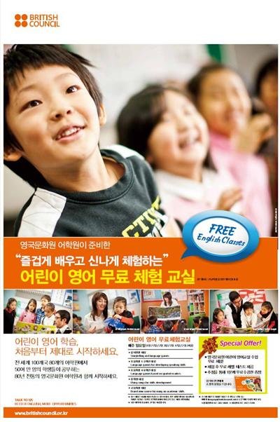 이번 주 일요일에 어린이 영어 무료체험교실이 영국문화원 어학원에서 열린다고 거기에 참석해 보라고 권유해 주시네요!