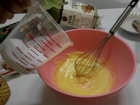 뮐가루와 붸이킹 퐈우더를 체쳐 넣고