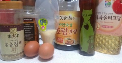 (1인분기준) 깨, 후추, 계란2개, 마요네즈, 간장, 참기름, 올리고당, 다진마늘, 햄, 밥