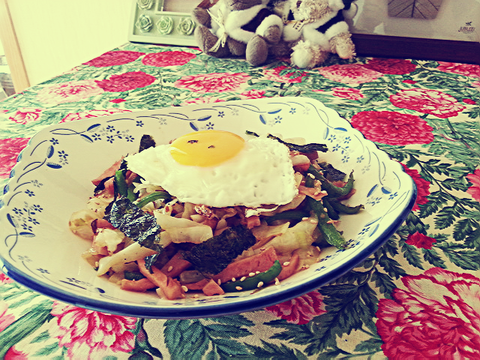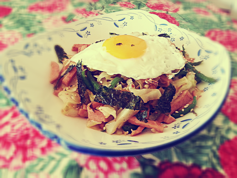 양배추, 피망, 햄을 소금간으로만 달달달 볶아서 밥 위에 얹고