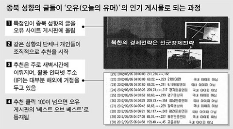이 기사 보면 알꺼야.국정원녀가 오유에서 북한 IP역추적하고 조사했던거.여기 진짜 북한 사이버 전사들과 빨갱이들이 활동하나봐오유에 활동하던 사람이 지금 국가보안법 위반으로 구속이 되어있는데국가 보안법 위반으로 구속되기 전인 5월에 올린 글이 베오베까지 갔다는거 나오고 지금 난리가 아냐