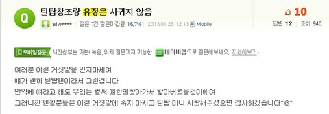 이렇게 지식인에까지.. 이런식으로 정은언니가 욕을많이 먹는데 솔직히 사겻다고 쳐도 축하해줘야 하는게 진정한 팬이라고 생각 되요ㅠㅠ 정은언니 정말 착하세요 예전에 싸이 주소 뿌려졋을때두 힘내시라는댓글에 하나하나 다 답해주셨고 트위터로도 언니팬들 항상챙겨주시구 멘션오는거일일히다 답장해주시고 전에는 카톡아이디 같은거 뿌려지셨었는데 그거보고 연락한 사람들한테도 잘해주시고 하셧데요 그리고 제가 고민이 있었는데 상담해주시겠다고 하시면서 카톡도 알려주시고 매일매일 카톡해도 다답장해주시고 암튼 디게 착하세요 언니 친구들께서 노래도 진짜 잘하신다고하셨음! 엔젤님들중에서도 정은언니한테 욕하다가 착한거알고 팬된분도 몇명봤어요 엔젤님들두 틴탑이 욕먹으면 많이 속상하시죠? 저도 제가 좋아하는 울림걸그룹언니들이 욕먹으면 많이 속상하답니다ㅠㅠ 사귄거 아니라고 정은언니가 얘기하셨엇어요 아예 모르는 사이라구 그리고 정은언니 전학오신거래요! 아무튼 너무 밉게만 보지말아주세요 이뿐정은언니투척!ㅎ,ㅎ