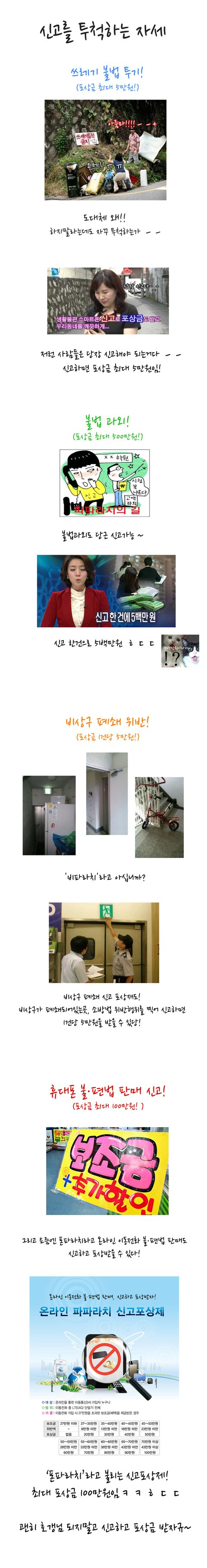 저거 직업 삼는 사람들 의외로 많음. 남자 4, 5명 몰려 다니면서 넥타이핀 카메라나 볼펜 카메라 옷에 끼우고 건물에 들어가서 비상구 확인하고 재래시장가서 중국산 그런거 다 잡고.. 포상금을 주는게 맞는거겠지만 좀 한심..