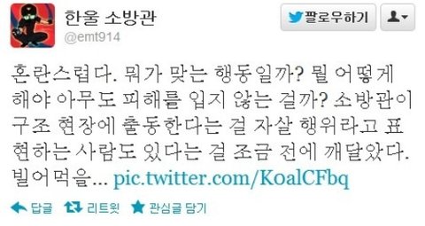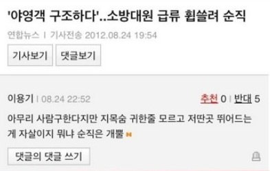 저는 현직 소방관입니다.이용기 말씀대로 지목숨 귀한줄 모르고 뛰어든 대원들 잘못도 있습니다.메뉴얼에도 위험하다 싶으면 아무리 요구조자가 있더라도 현장접근을 금지시키니깐요.하지만 실제 현장에나가서 아우성치는 요구조자들 보면 아무생각이 안납니다.그저 구해야 겠다는 생각뿐이죠. 영화 반창꼬에 이런대화가 있더군요 " 당신 앞으로 위험한데 않들어간다고 약속해." " 소방관 때려치워라는 얘기냐?"어느 현장에 가나 위험한것도 알고 죽을수도 있다는것도 알고도 불나방처럼 뛰어드는게 소방관되면 누구나 생기는 직업병입니다..