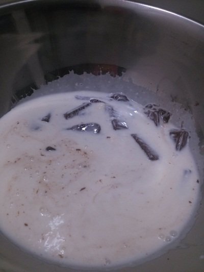 그담에 초콜릿과 우유를 전자레인지에 넣고 20초마다 저어주면서 초콜릿이 타지 않게 잘 녹여줍니다![]()