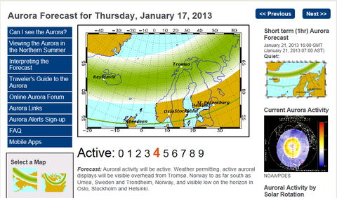그러나 오로라예측값 외에 실제 지상에서 오로라를 관측할 수 있는지 여부에 가장 중요한 영향을 미치는 것은 그날의 기상 상황. 눈이 오거나 구름이 끼거나 보름달이 떴거나 밝은 곳에서 관찰하려하면