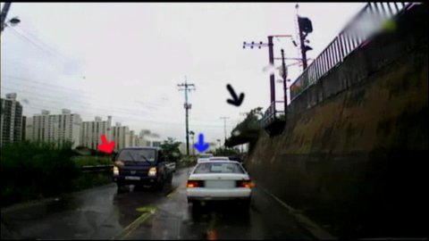 빨간 화살표의 트럭이 지나가자마자 흙더미는 앞에 승용차 두대를 덮쳤고, 아까 파란 화살표의 승합차는 마치 시간을 딱 맞춘듯이 들어서자마자 쏟아진 흙더미에 휩쓸려 몇미터 아래로 함께 떨어집니다.