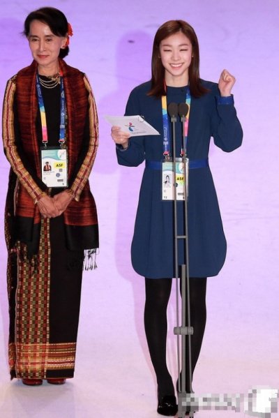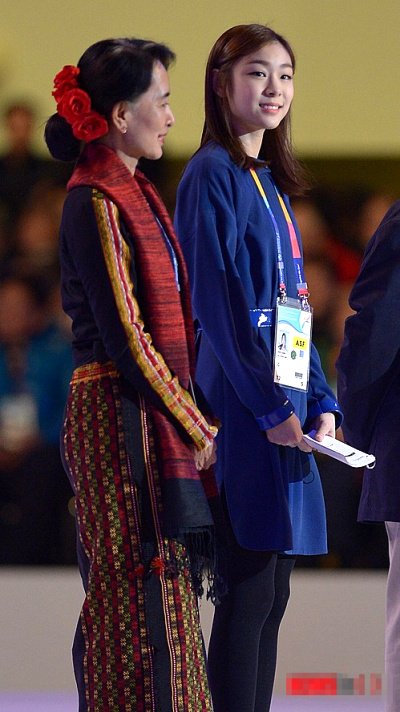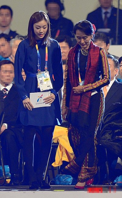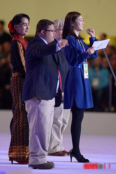 아웅산 수치 여사와 함께 단상에 오르는 연느