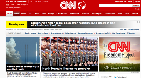 미국 CNN 에서도 나로호발사를 스팟라이트 햇는데요. 이상하게도, 남북한을 같이 나란히 1면에 도배해서 눈길을 끄내요.. 기분좀나쁜건, 마치 북한 미사일발사/핵이랑 우리 자랑스러운 나로호발사랑 관련이있다는 뉘앙스를 풍기는것같은데요.. 나로호는 정말 10년전부터 준비해온건데, 북한이 갑자기 지난 12월에 로켓발사성공해서 마치 남한도 냉전시대를 연상케하는 Arms Race (무기 개발 레이스) 를 시작한다는것처럼 느낌이 드네요..