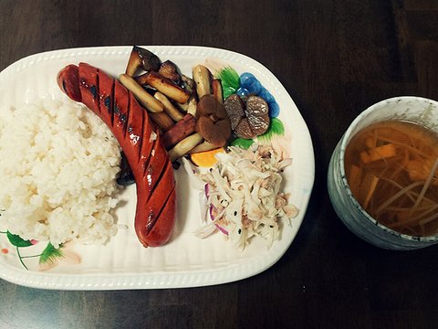 밥 + 소세지 + 닭가슴살 샐러드 + 버섯 구운거 + 마늘 장아찌 + 콩나물국