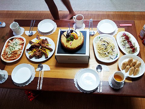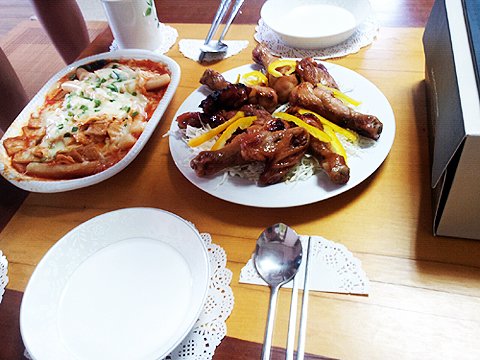 케이크를 중심으로 왼편에는 치즈떡볶이 + 닭다리 간장 구이