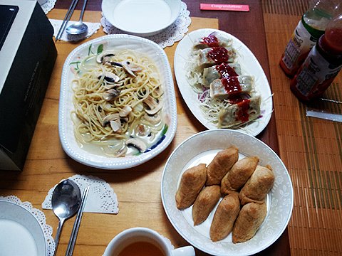 크림스파게티 + 비빔만두 + 유부초밥 이에요.