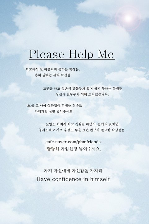 안녕하세요.저는 현재 경기도 김포에서 재학중인 한 고3남학생입니다. 요즘 학교폭력, 왕따에 대한 심각성이 줄지않고 여전히도 곳곳에서 흔히 일어나고 있습니다.. 제가 이번 7월달에 이런 아픔을 가진 친구들과 같이 서로서로 얘기도 들어주고 고민상담도 하는 그런 분위기를 만들고자 카페를 창설하게 되었습니다. 맛집도 탐방하고 모여 얘기도, 놀기도하면서 좋은 시간을 보내고 추억을 만들었으면 좋겠습니다.