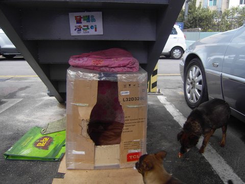 원래 어미개 달래는 주차장 관리 컨테이너 박스 밑에 작은 틈에서 살다가, 그나마 있던 컨테이너 박스까지 치우게 되어 잘 곳 조차 없게 된 것을 샤이니님과 한 아주머니께서 만들어주게 된 것이지요.