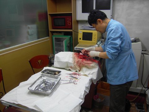 달래의 정확한 진단을 위해, 또한 중성화 수술을 위해 개복 수술을 하고 있는 중.