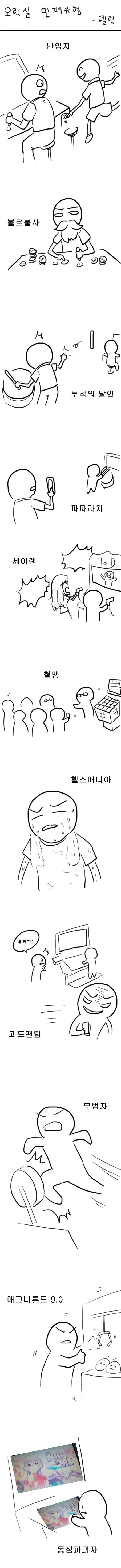 난입자 - 2P 가능한 오락에서 1P 여유롭게(?) 즐기고 있는데 2P 난입불로불사 - 동전 몇십개(?) 쌓아놓고 돈 다쓸때까지 안 떠남투척의 달인 - 태고의 달인인가 막대기로 북 후려패는 오락 있는데, 그 막대기로 후려패다 놓친 상황파파라치 - 하라는 오락은 안하고 남이 하는 거 찍어서 소장하는 놈세이렌 - 하우스오브데드 같은 거 하는 사람 중 꼭 소리 꽥 지르는 인간 꼭 있음(주로 여자인 듯)혈맹 - 꼭 사람들 앞에서 자랑하려는 사람[이건 불확실함]헬스매니아 - 손 말고 온 몸 쓰는 오락만 하는 사람 지칭?(DDR이나 농구공넣기 같은???)괴도 팬텀 - 카드 넣으면 온라인 지원하는 오락이 있음. 그 카드 훔쳐서 달아나는 절도범 새퀴무법자 - 하라는 대로 안 하고 지멋대로 하는 인간(주로 펀치에서 발길질)매그니튜드 9.0 - 인형뽑기 기계 흔드는 인간동심파괴자 - 요즘 오락실 가면 흔히 오덕냄새 풍기는 일본애니 소재 게임이 많음 즉 하라는 오락은 안하고 일본애니캐릭보면서...... [참고 : '괴도 팬텀'에 해당되는 게임이 대다수] 이거 쓰다 고쳐쓰려고 백스페이스 눌렀는데 뒤로가기 됨 이걸 이해하고 쓰는 난 뭐냐 글쓴이 이거 말하고 싶었음???