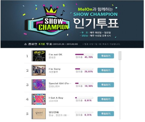 요 인기투표는 매주 30팀 뽑아서 화요일까지 멜론 홈페이지 뮤직온 TV에서 진행된다.