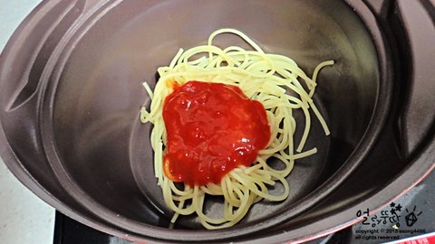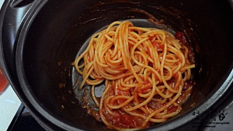면을 삶고 소스 투척 (쫌많이 면이 건조해보이네요.....버터 올리브유를 조금 넣어주세요)