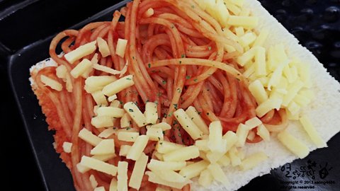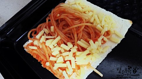 식빵위에 면을 가지런히 나름 정성스럽게 올려주고 치즈를 솔솔 뿌려줌