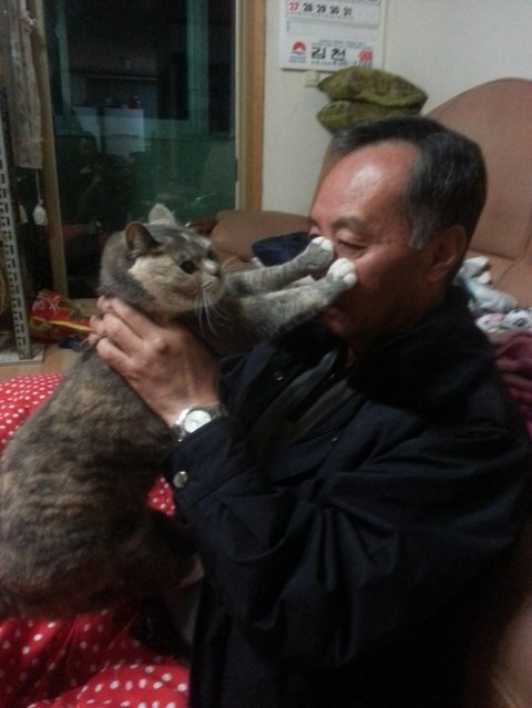 안고 있는 사진인데,,,마치 집사가 김괭 헤드락 걸고있는 듯한...