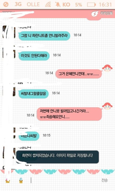 강자한테 약하고 약자한테 강한사람은 쓸모없는사람이라며 어렸을 때부터 듣고자란 글쓴이는 이해 할수 없음 남의 물건이 탐이나면 빌리고 곱게 줄 것이지 자꾸 빌려달라고하는건 엄연히 빌리는게 아니라 갈취하는거임. 우리 모두 물건관계를 확실히하고 선배라도 부정한 짓을 하면 고쳐줘야하는게 개념있는 후배라고 생각함. 무튼 오늘 하루 참길었음................... 마지막으로 이거보고있는 ㅇㅇ언니 이거 올린거 원래 프사랑 언니이름 않지울라켓는데 언니 인권도 있고 그래서 지웠으니까 자꾸 뭐달라하지마세요 경찰서 가면 괜히 정없어보이잖아요. 안녕히계세요