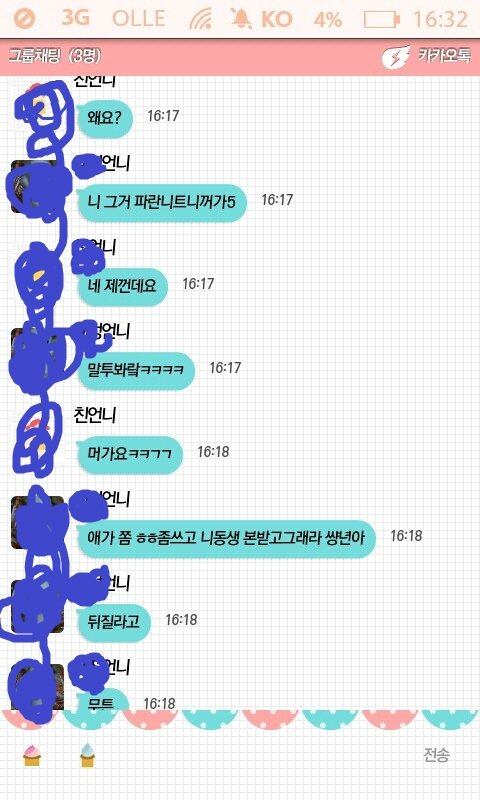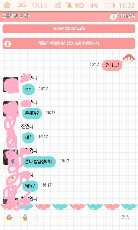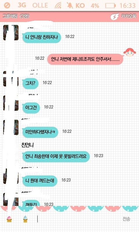 언니 있는 사람은 알지않음?? 언니옷 몰래입었다가 누가 빌려달라고하면 얼마나 난처한지...하지만 선배라는 것은 변명으로 밖에 안들리나봄.. 그래서 언니꺼라고 계속하니까 언니를 초대하래서 옆에있는 언니한테 사정을 말해서 그룹 채팅을시작함.