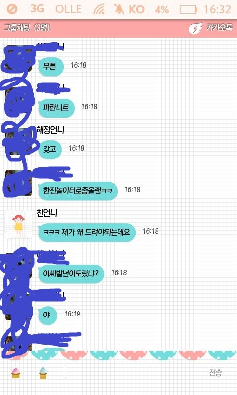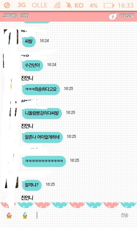 여기서 짤린게 있는데..우리 언니가 그만 사고를침... 친구한테 보내려던걸 그룹채팅에다가 침... 님들 그실수 자주 하지않음?ㅎㅎㅎ 나만그럼?ㅎㅎㅎㅎ 언니가 "ㅇㅇ가 일찐놀이한닥ㅋㅋㅋㅋ"이라고 당당히침...ㅎㅎㅎㅎㅎ언니 사랑해