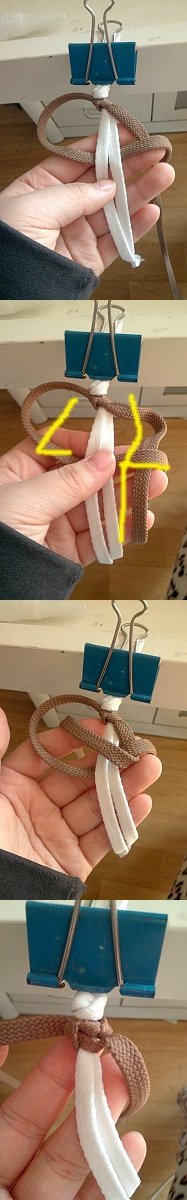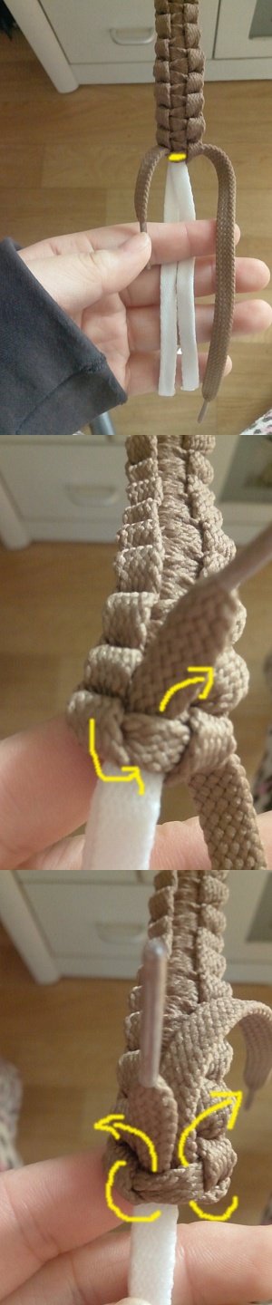 오른쪽줄을 중심줄의 뒤로보내셔서 고리를 만들어주시고