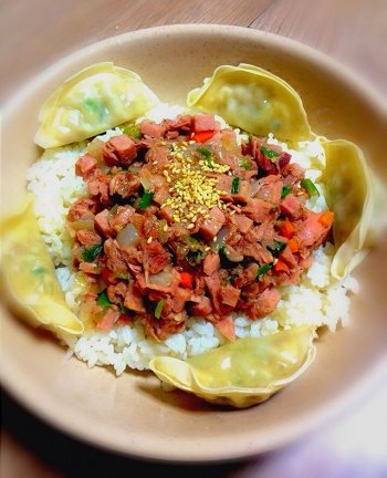 최대한 느끼하지 않게 멋대로 만든 소스로 만든 군만두 & 돼지고기가 없어서 스팸으로 대처한 짜장볶음밥