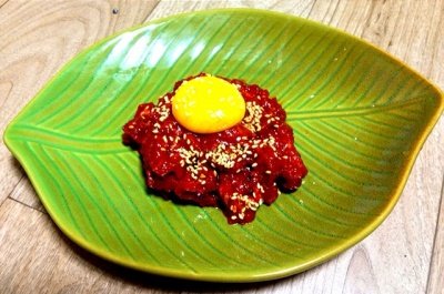딱히 맞는 부위가 없어서 아삭하게 적당히 해동한 국거리용 고기로 대처한 육회 배+오이가 없어서 아쉽..