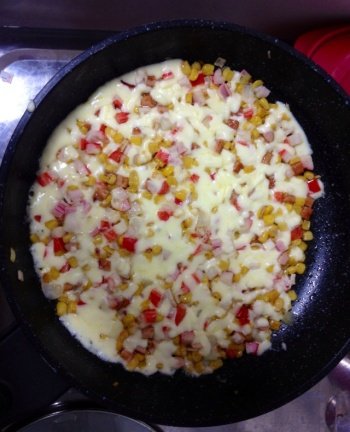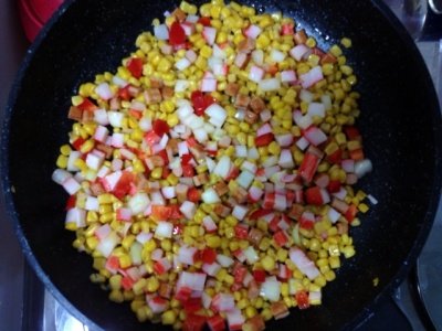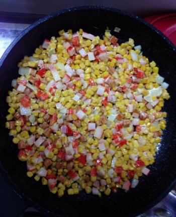위에는 햄,맛살,옥수수콘,양파,파프리카를 넣고 볶는중