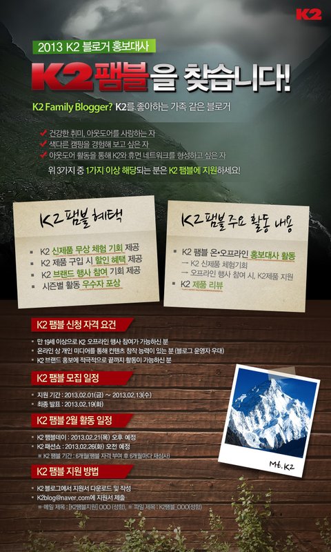 아웃도어 브랜드 K2 블로거 홍보대사, K2팸블 모집하네요^^