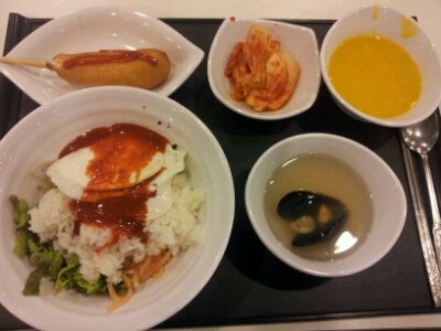 비빔밥+핫도그+홍합국+호박죽=Good